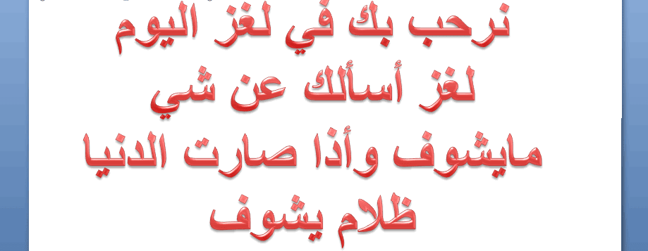 اسألك عن شي مايشوف. معروف عند البدو يقدمونه للضيوف له يدين واصبعين لا إنسان ولاحيوان ويمشي مثل الأنسان أول حرف مثل أخر حرف. اسألك عن شي ما يشوف واذا صارت الدنيا ضلام يشوف. وإذا صارت ظلام الدنيا يشوف. حل لغز اسألك عن شي مايشوف ولا صارت الدنيا ظلام يشوف بحث عنه الكثير ولكن القليل القليل من استطاع ان يصل الي حل هذا الغز لان هذا للغز حير كل من سمعه وطرح له فلا يوجد شئ في الظلام وايضا في الظلام يشوف فما هو هذا الشئ الذي.