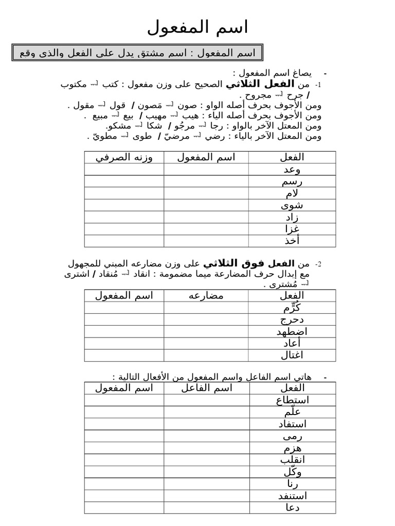 اوراق عمل اسم مفعول لمادة اللغة العربية الفصل الاول لصف التاسع في الامارات