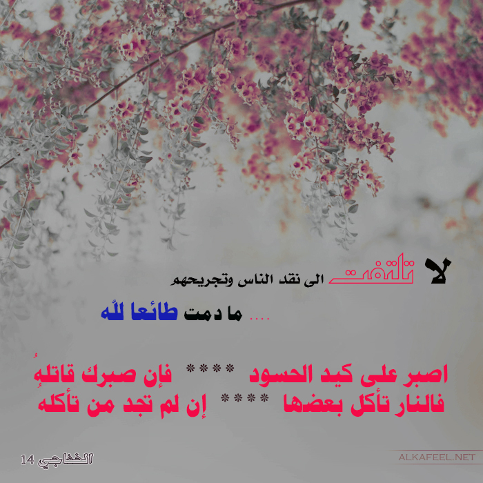 إصبر على كيد الحسود فـإن صبـرك قاتـــــلـه فالنار تأكـل بعضهــــــــا أن لم تجد مـا تأكـلـــه الدنيا مسألة حسابية فخذ من اليوم عبرة ومن الامس خبرة اطرح منها التعب والشقاء واجمع لهن